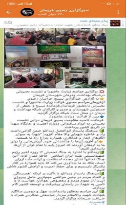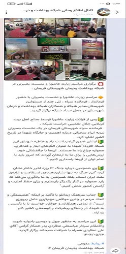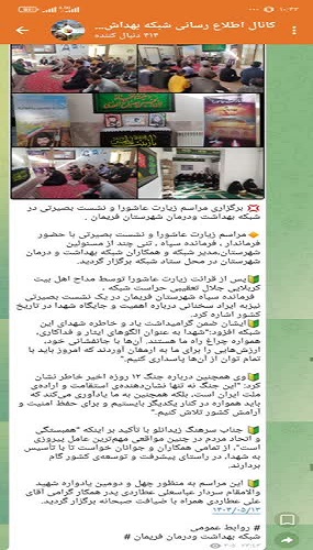 🔸مراسم زیارت عاشورا و نشست بصیرتی با حضور فرماندار ، فرمانده سپاه ، تنی چند از مسئولین شهرستان،مدیر شبکه و همکاران شبکه بهداشت و درمان شهرستان در محل ستاد شبکه برگزار گردید.