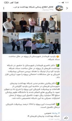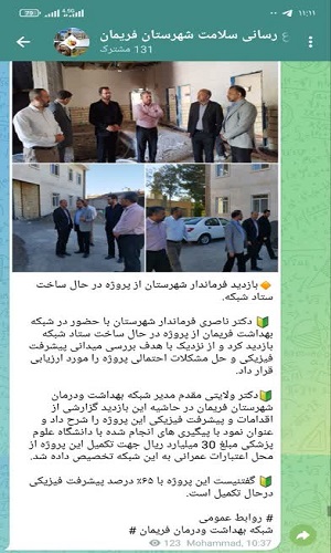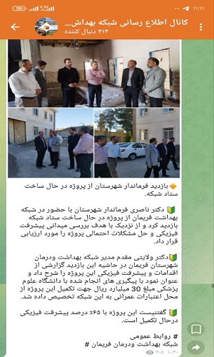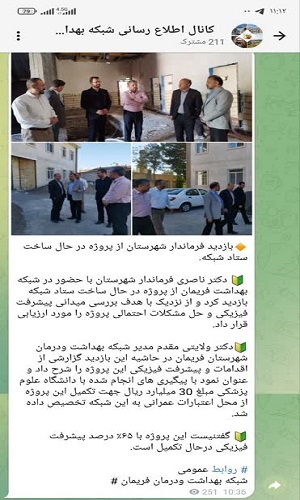 🔰دکتر ولایتی مقدم مدیر شبکه بهداشت ودرمان شهرستان فریمان در حاشیه این بازدید گزارشی از اقدامات و پیشرفت فیزیکی این پروژه را شرح داد و عنوان نمود با پیگیری های انجام شده با دانشگاه علوم پزشکی مبلغ 30 میلیارد ریال جهت تکمیل این پروژه از محل اعتبارات عمرانی به این شبکه تخصیص داده شد.