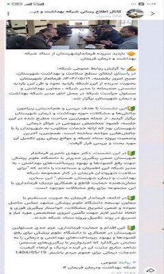 در راستای ارتقای سطح سلامت و بهداشت شهرستان، صبح امروز یکشنبه، ۱۴۰۴/۰۵/۱۹، فرماندار شهرستان بصورت سرزده از این شبکه بازدید نمود و طی این بازدید نشستی صمیمانه با مدیر شبکه ، معاون بهداشتی و مسئول حراست شبکه در محل اتاق مدیر شبکه بهداشت و درمان شهرستان برگزار شد.