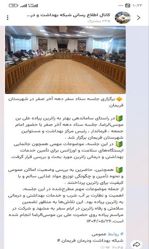 از جمله موضوعات مهم مطرحشده در این جلسه، اهمیت و نظارت بر آب شرب و خدمات بهداشتی و درمانی به زائرین پیاده بود. این تلاشها به منظور تضمین سلامتی و رفاه زائرین در ایام سفر به مشهد و شرکت در مراسم پیاده روی حضرت علی بن موسیالرضا انجام شده است.