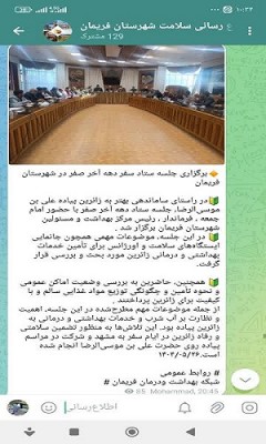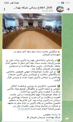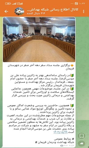 🔰در راستای ساماندهی بهتر به زائرین پیاده علی بن موسیالرضا، جلسه ستاد دهه آخر صفر با حضور امام جمعه ، فرماندار ، رئیس مرکز بهداشت و مسئولین شهرستان فریمان برگزار شد .