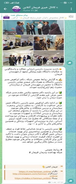 🔰 مدیر بازرسی با توجه شناسایی نقاط قوت و ضعف بیمارستان و همچنین برنامهریزی برای بهبود خدمات درمانی ضمن گفتگو با کادر درمان عنوان داشت با تأکید بر اهمیت ارتقاء کیفیت خدمات درمانی و بهبود شرایط کاری برای کارکنان، مشکلات و چالشهای موجود مطرح شده در سطح بالاتر پیگیری خواهد شد.