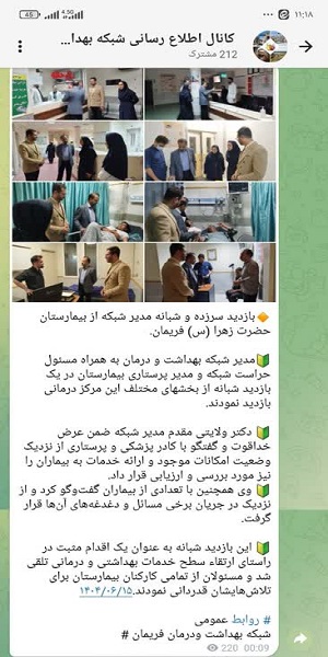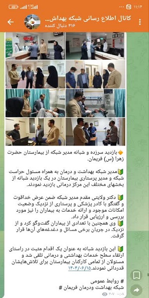 🔸بازدید سرزده و شبانه مدیر شبکه از بیمارستان حضرت زهرا (س) فریمان.