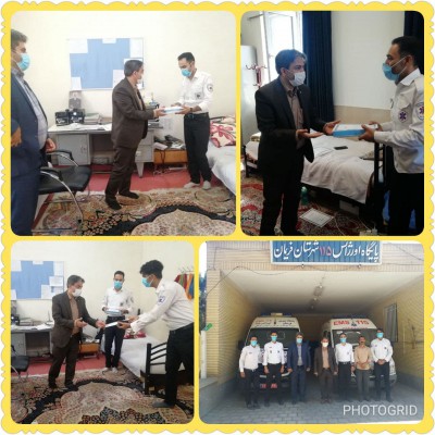 به گزارش روابط عمومی شبکه بهداشت و درمان فریمان ،همزمان با فرارسیدن 26 شهریور ماه سالروز تاسیس اورژانس و روز ملی اورژانس و فوریت های پزشکی ،دکتر مصطفی جعفری مدیر شبکه به همراه معاونبهداشتی شبکه با حضور در پایگاه های اورژانس شهری و جاده ایمحور فریمان ضمن عرض خدا قوت، با اهدای لوح تقدیر از زحمات این عزیزان تشکر و قدردانی کردند.