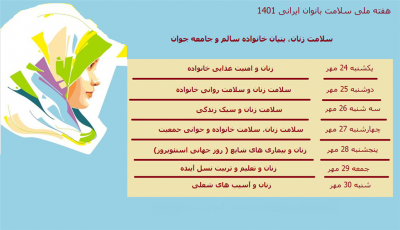 هفته ملی "سلامت بانوان ایران"، همه ساله در هفته پایانی مهرماه با هدف اطلاع رسانی و حساس سازی گروههای مختلف جامعه در خصوص اولویتهای سلامت زنان به عنوان نیمی از جمعیت کشور، برگزار می شود.