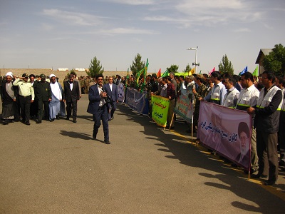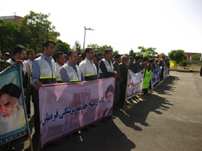 به مناسبت سوم خرداد ماه ، سالروز آزاد سازی و فتح خرم شهر مراسم صبح گاه مشترک با حضور نیروهای مسلح، بسیجیان اقشارمختلف و ادارات در ناحیه مقاومت بسیج شهرستان فریمان برگزار شد.میهمان ویژه این مراسم، سردار سرلشکر محسن رضائی دبیرمجمع تشخیص مصلحت نظام بودند. اعضاء کانون بسیج جامعه پزشکی فریمان هم مانند همه بسیجیان در این مراسم حضور پر شورداشتند.لازم بذکر است که این مراسم با حضور نماینده شهرستان در مجلس شورای اسلامی،فرماندار،امام جمعه ،اعضاءشورای شهر،فرماندهی انتظامی ،فرمانده سپاه ناحیه فریمان و مسئولین سایر ادارات برگزار گردید. |