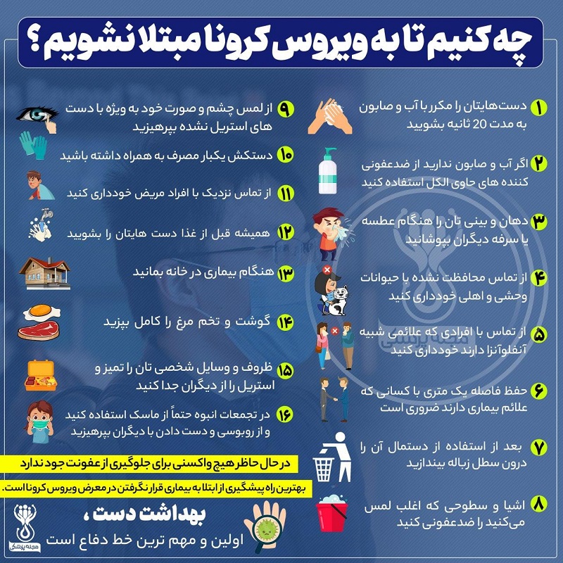 فراموش نکنید تحت هیچ شرایطی و در هیچ ساعت روز و در هیچ مکانی به صورت خود (چشم، بینی و دهان) دست نزنید.