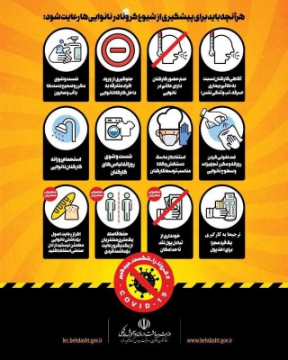 -از تماس دست با صورت و همچنین تماس با سطوح آلوده مانند دستگیره در، پول، گوشی موبایل و ... خودداری کنند و در صورت تماس، بلافاصله دست ها را با آب و صابون بشویند.